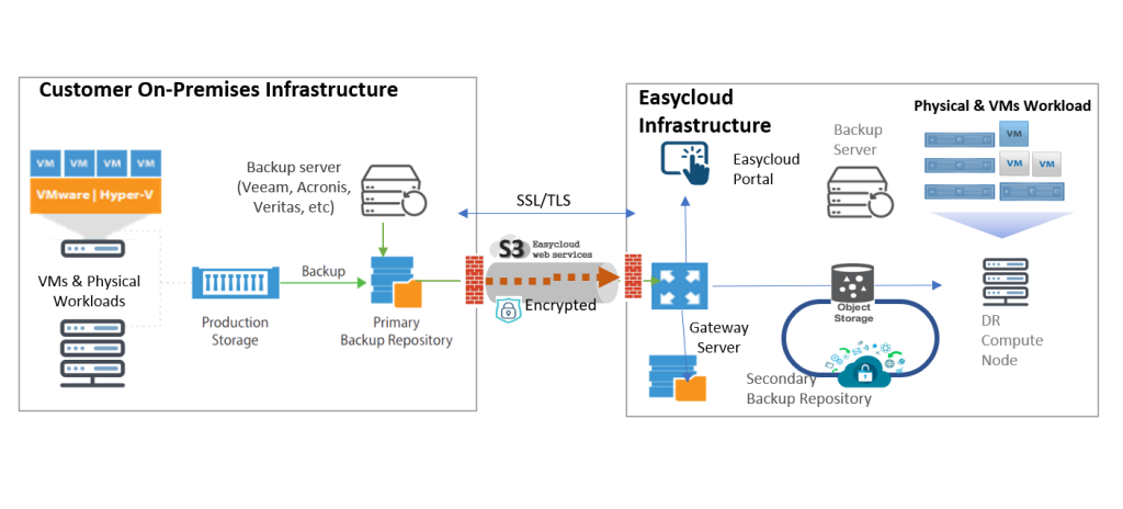 Disaster recovery provide backups and replicate to Easycloud and easily create virtual standby machines in the DR cluster in just a few clicks. Fast system and data recovery is assured by having continual updates processed to a virtual machine that can be activated immediately if there’s an issue event operation of any disaster recovery required.